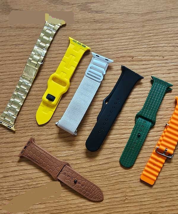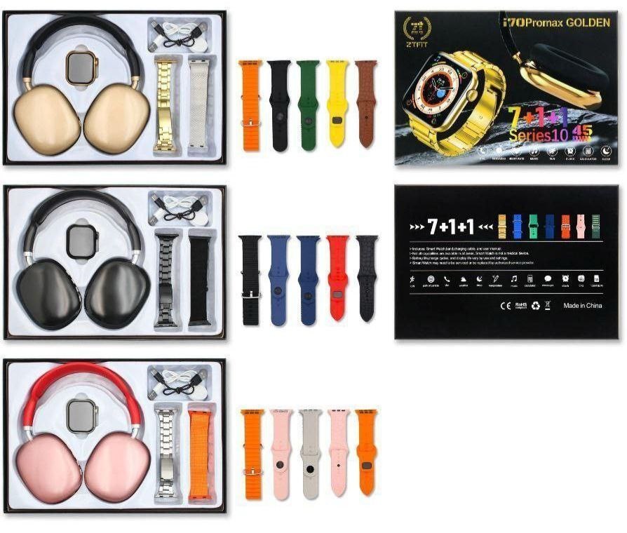 - ساعت هوشمند i70 Promax Golden بدنهای از آلومینیوم/فلز با بند سیلیکونی یا فلزی بسیار قابل تغییر (مدلهای «9 in 1 set» با 7 بند مختلف) .